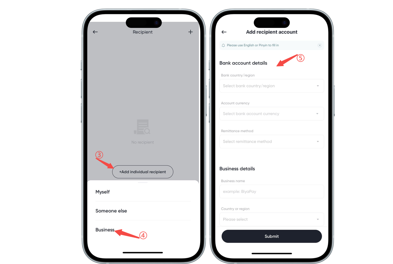 Select [Remit to business], please fill in the bank account information and company information as required, and then click submit