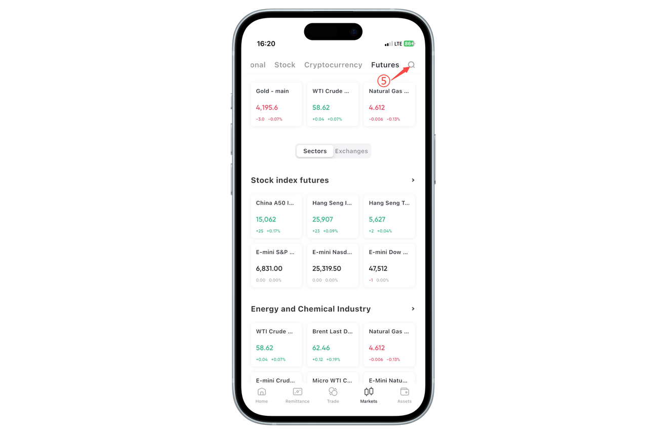 Open [Market] in the bottom navigation bar of the App, slide in the horizontal category at the top and click [Futures] to enter the futures market page.