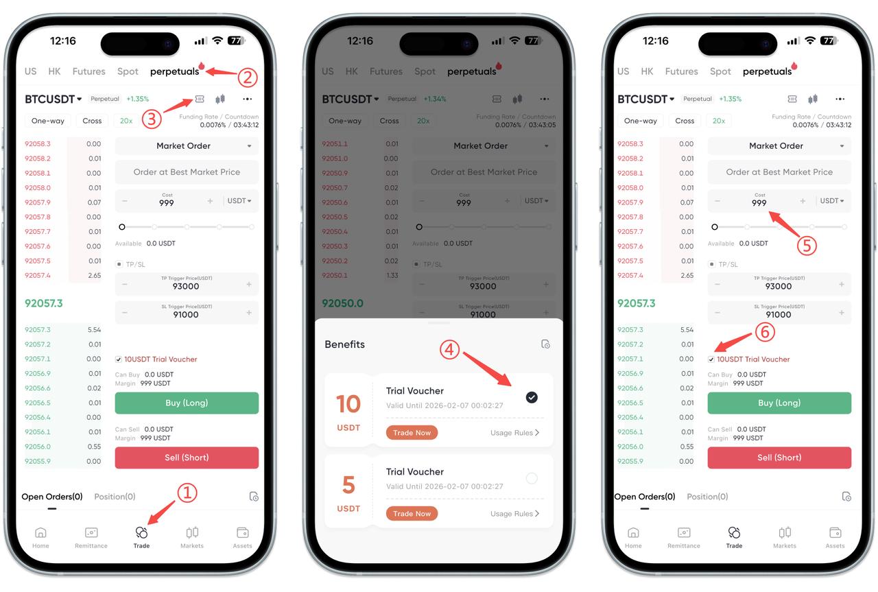 Click the "Trading" option, switch to the "Contract" trading page, select "Benefits", check the contract trial fund you want to use, manually fill in the contract position amount you want to order *(Contract position amount = Contract trial fund face value × Leverage multiple)*, click Buy (Long) or Sell (Short) to start your first contract trading experience!