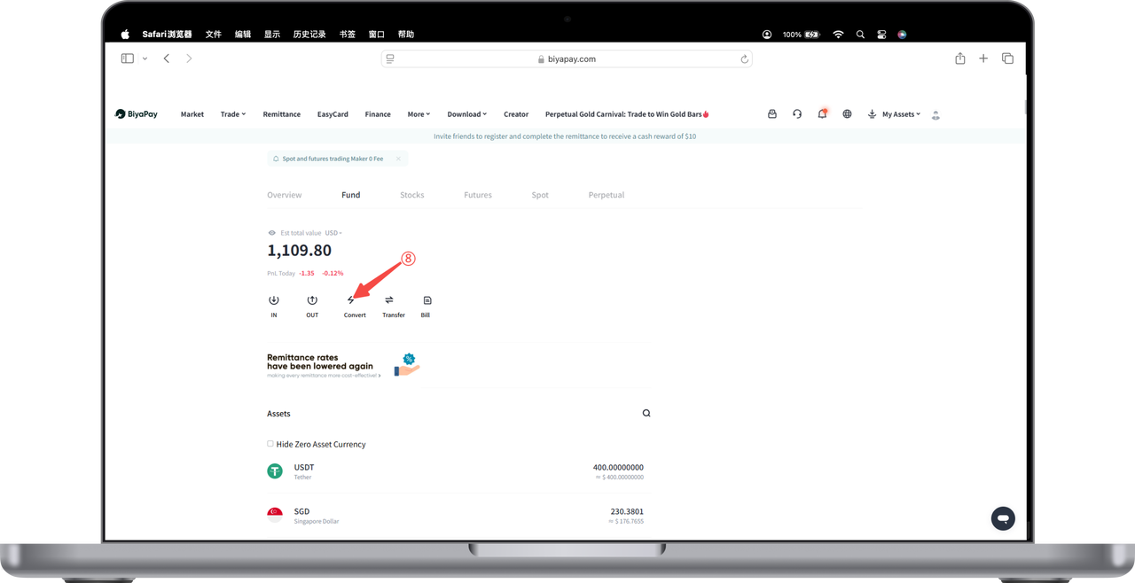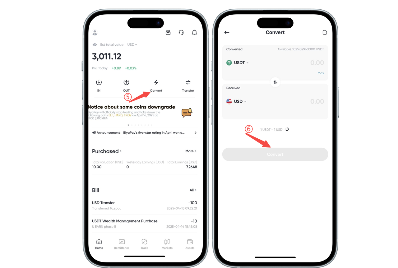 1. Click [Flash Exchange] on the funds page to exchange USDT to USD first