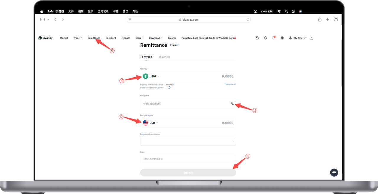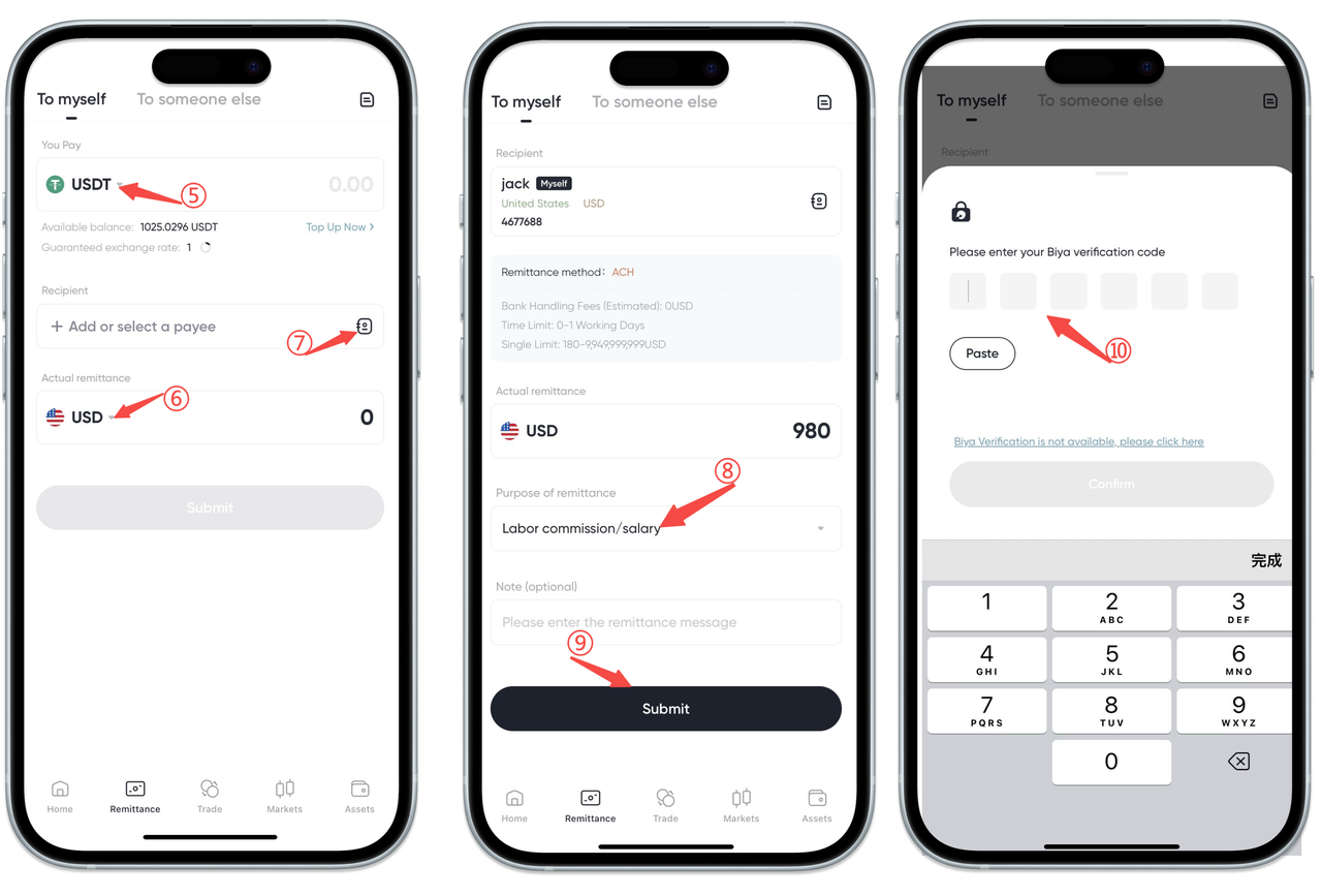 On the [Remittance] page, select remit USDT, actual remit USD, select payee account, enter email verification code or Biya authenticator code for withdrawal.