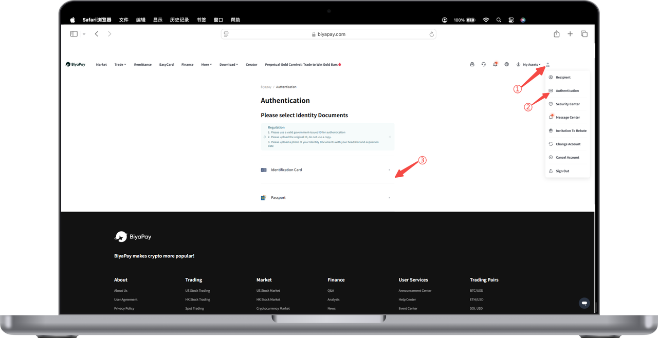 Click the avatar icon in the upper right corner of the webpage, enter the personal center, click [Identity Authentication], select [ID Card] or [Passport] authentication