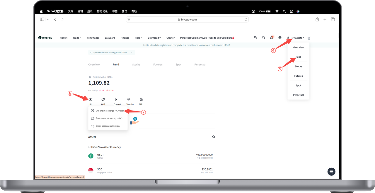Taking recharging USDT to remit USD as an example, here is the specific process
