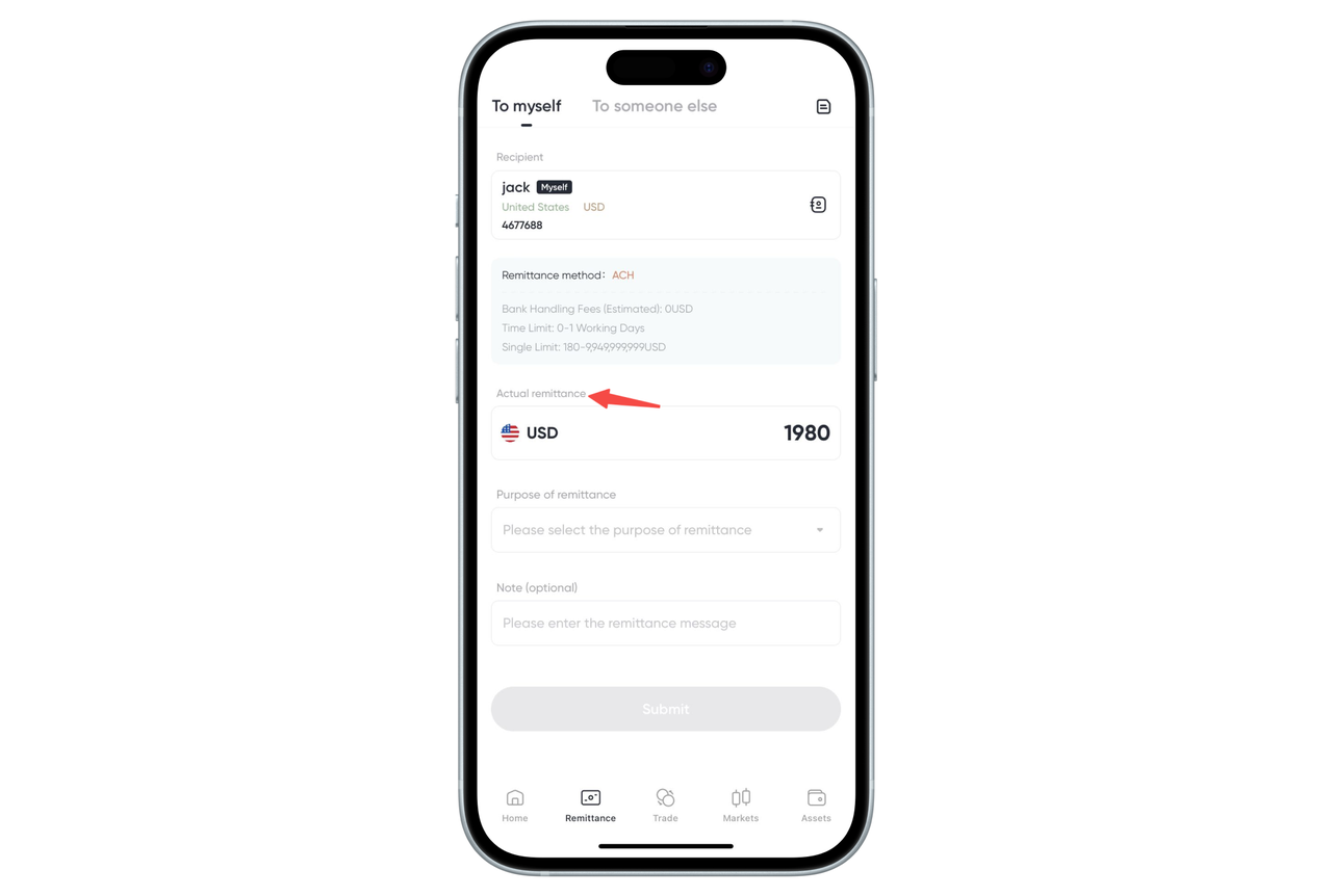 You can remit a specific amount. On the [Remittance] page, after you enter the remittance amount and select the receiving account, the amount displayed in the actual remittance is the specific amount we remit for you.