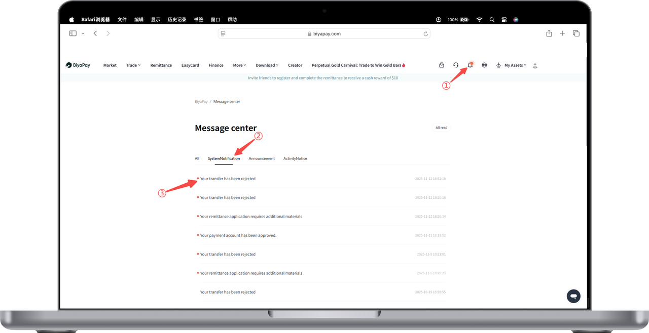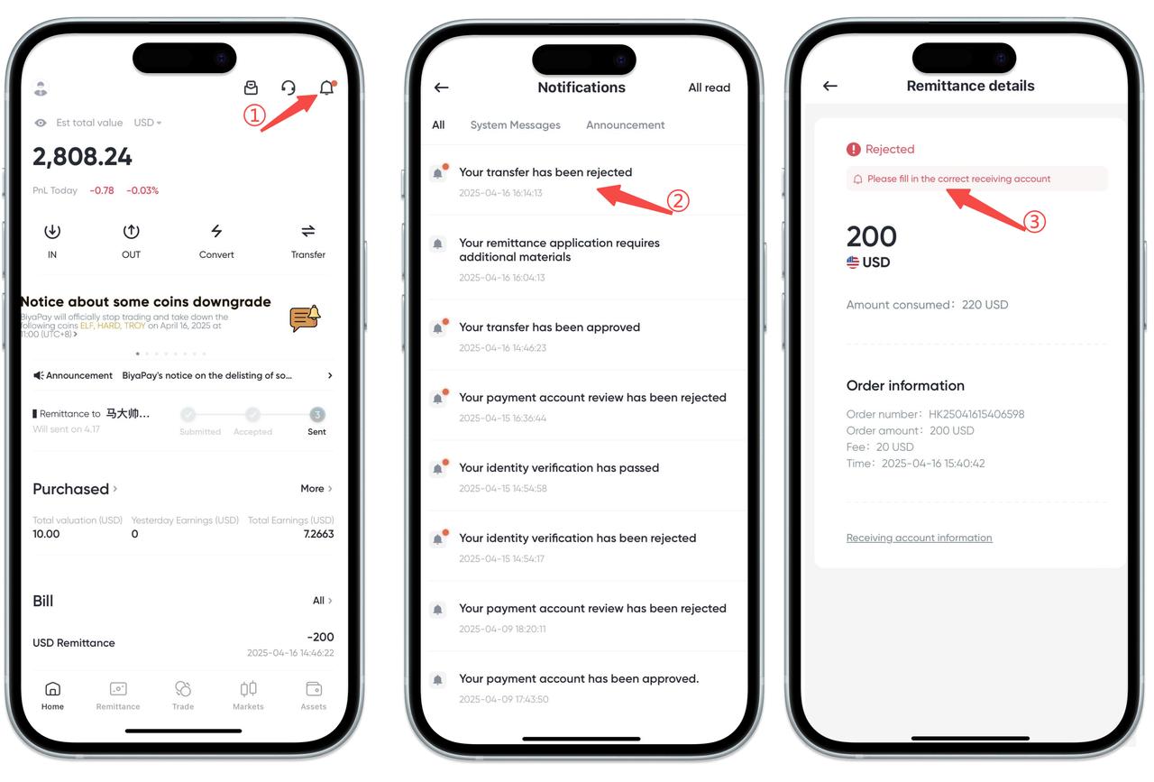 If the remittance order is cancelled, you can click the [Message Center] in the upper right corner of the APP to view the cancellation reason, or check your registered email to see if the customer service email has sent you an email explaining the remittance cancellation reason.