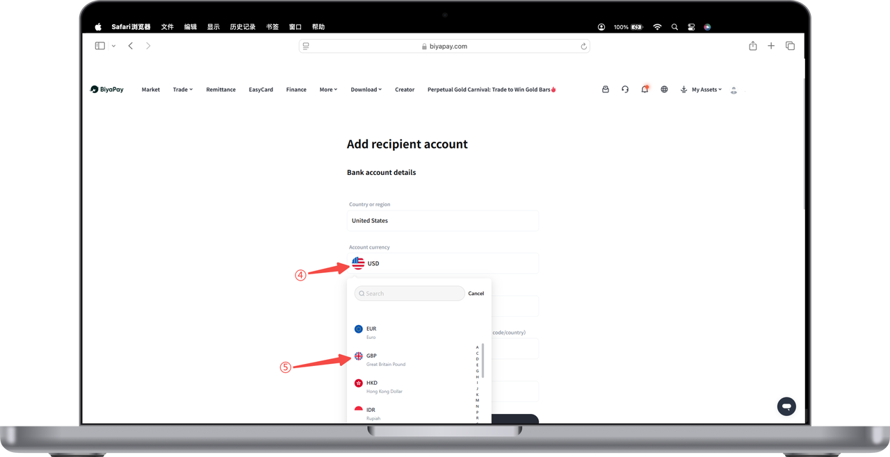 The supported currencies will change according to business adjustments. You can view the latest list at any time in the "Select Currency" option when binding the receiving account on the BiyaPay [Remittance] page.
