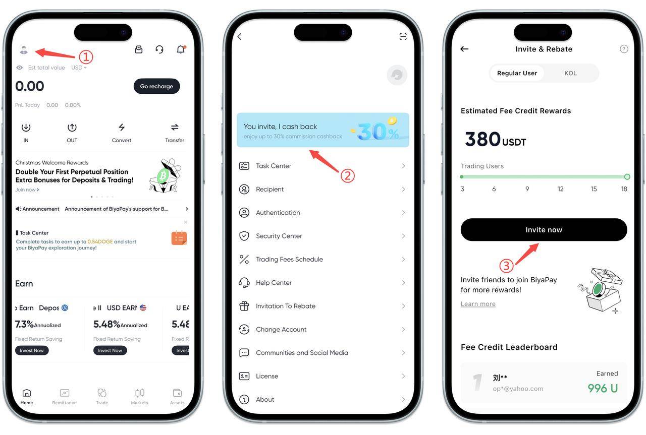 Open the BiyaPay App, click on the avatar in the upper left corner of the homepage to enter "Personal Center", find and enter the "You invite, I reward" page.