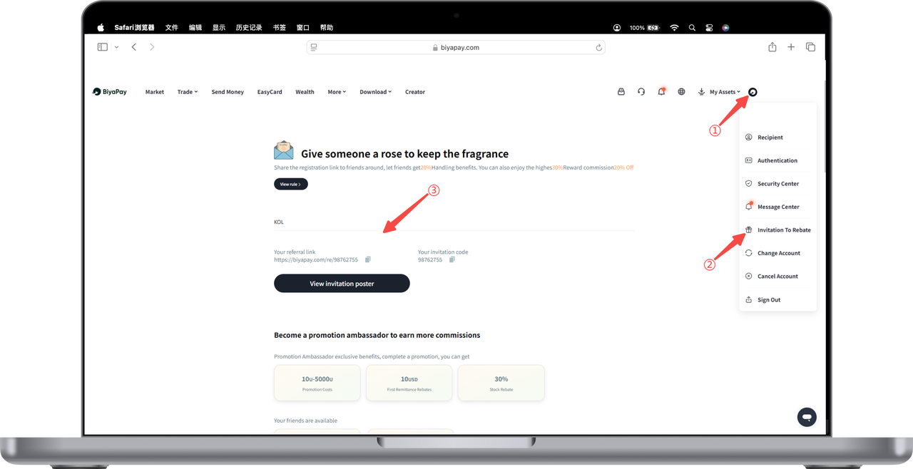 Open the official website, click on the avatar in the upper right corner - [Invite Rebate], click "Copy" the invitation link, or "Invitation Poster", and send it to your friends. Your friends can register BiyaPay to trade stocks through your invitation channel.
