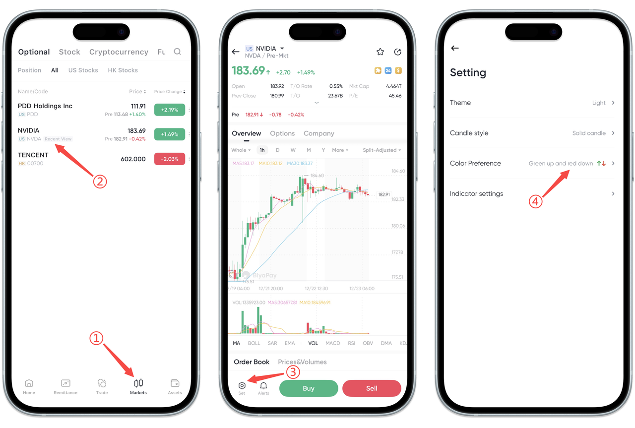On the [Market] page, click on any stock to enter the stock chart page, then click the [Settings] button at the bottom left of the chart, and then select the [Rise and Fall Preference] option, and you can set the color of rise and fall according to your personal preference.