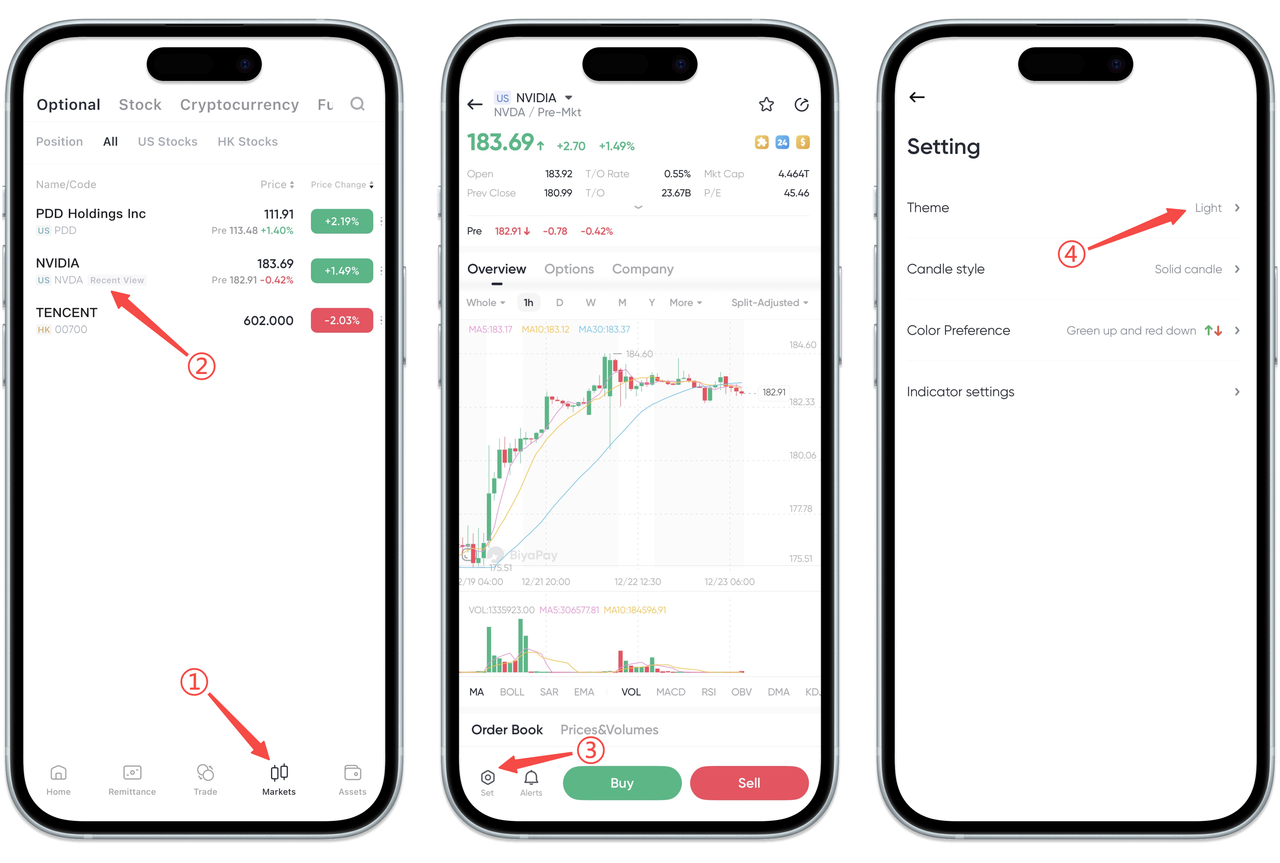 On the [Market] page, click on any stock to enter the stock chart page, then click the [Settings] button at the bottom left of the chart, and then select the [Theme Mode] option, and you can set the dark and light stock chart page according to your personal preference.