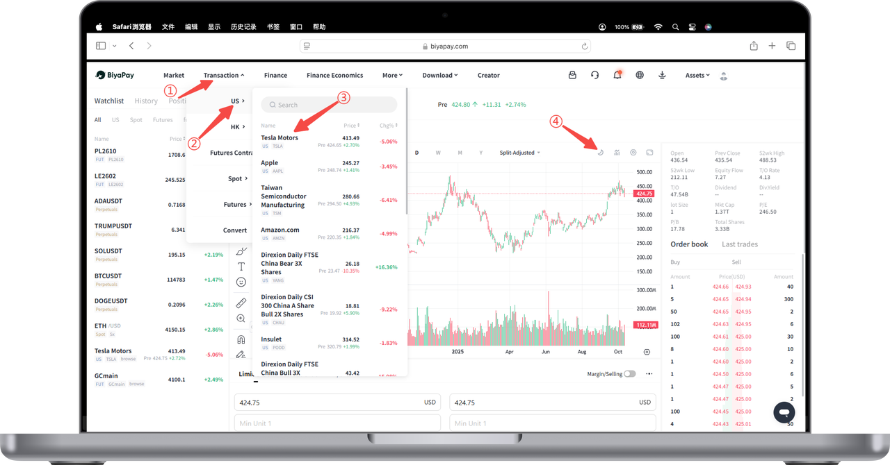 Open the official website, click [Trade] - [US Stocks] in the upper left corner, select any stock, and click the moon or sun icon in the upper right corner of the trading page to set the dark and light stock chart page.