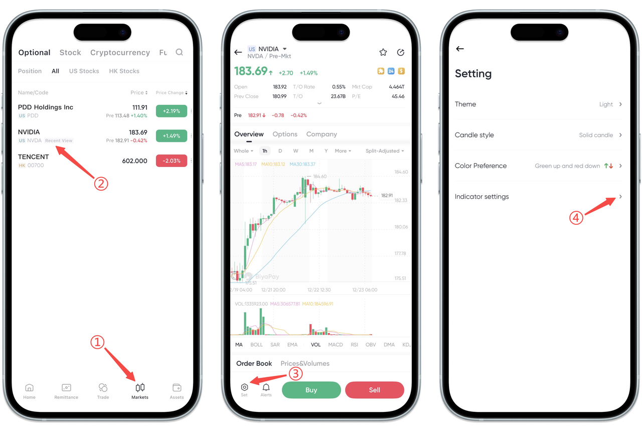 On the [Market] page, click on any stock to enter the stock chart page, then click the [Settings] button at the bottom left of the chart, and then select the [Indicator Settings] option, and you can set stock indicators according to your personal preference.