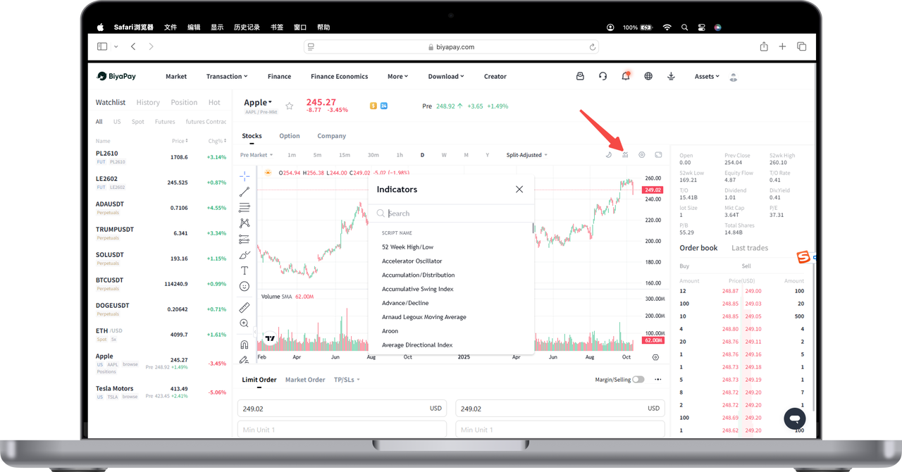 On the [Market] page, after entering the stock chart page you want to add, click the indicator icon in the upper right corner of the chart, and you can set stock indicators according to your personal preference.