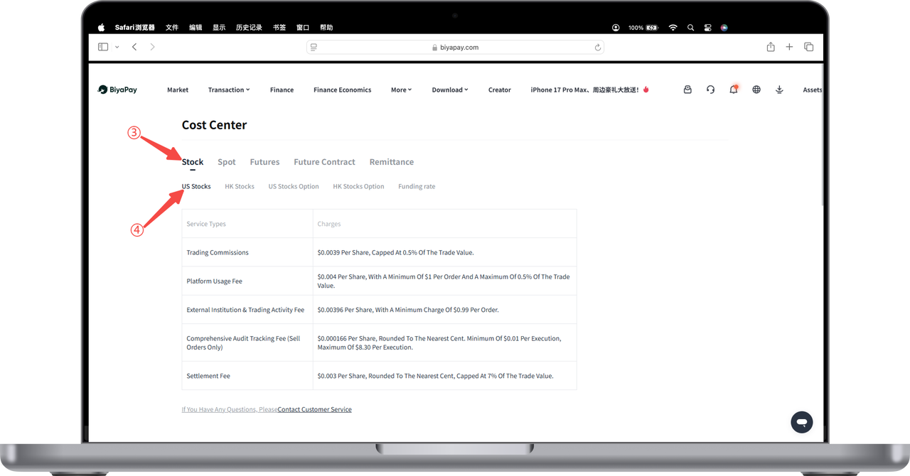 4. Select [Commission] in the pop-up menu to jump to the fee center. Click on US stocks in the fee center to view the detailed fee standard for various US stock commissions.