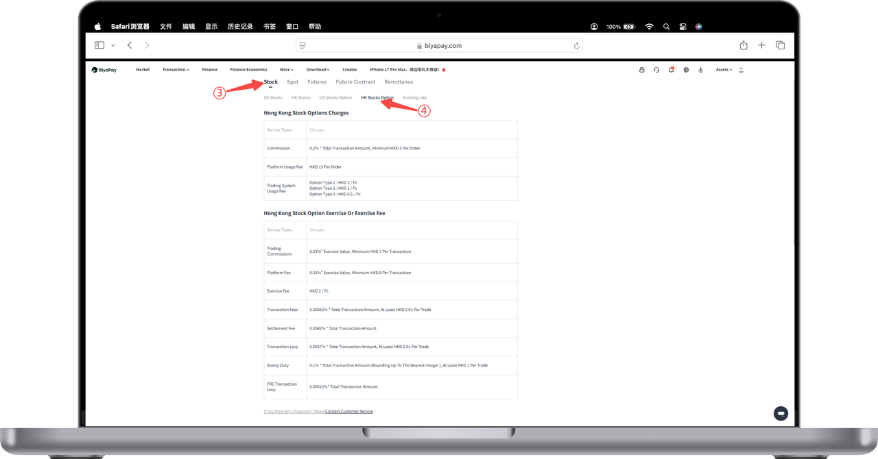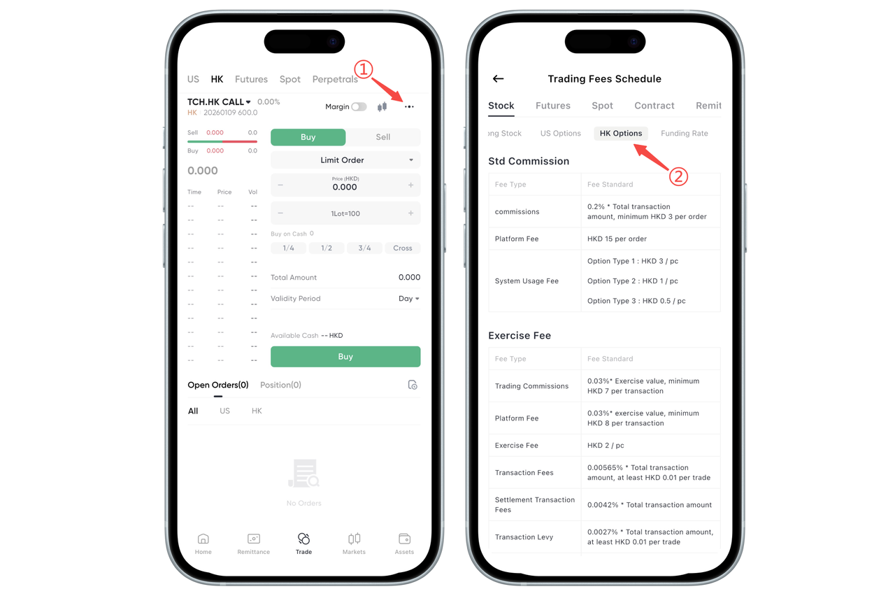 On the app, click on any Hong Kong stock option [Trade] page in the upper right corner of the three small dots will jump to the fee center. Click on Hong Kong stock options in the fee center to view the detailed fee standard for various Hong Kong stock option commissions.