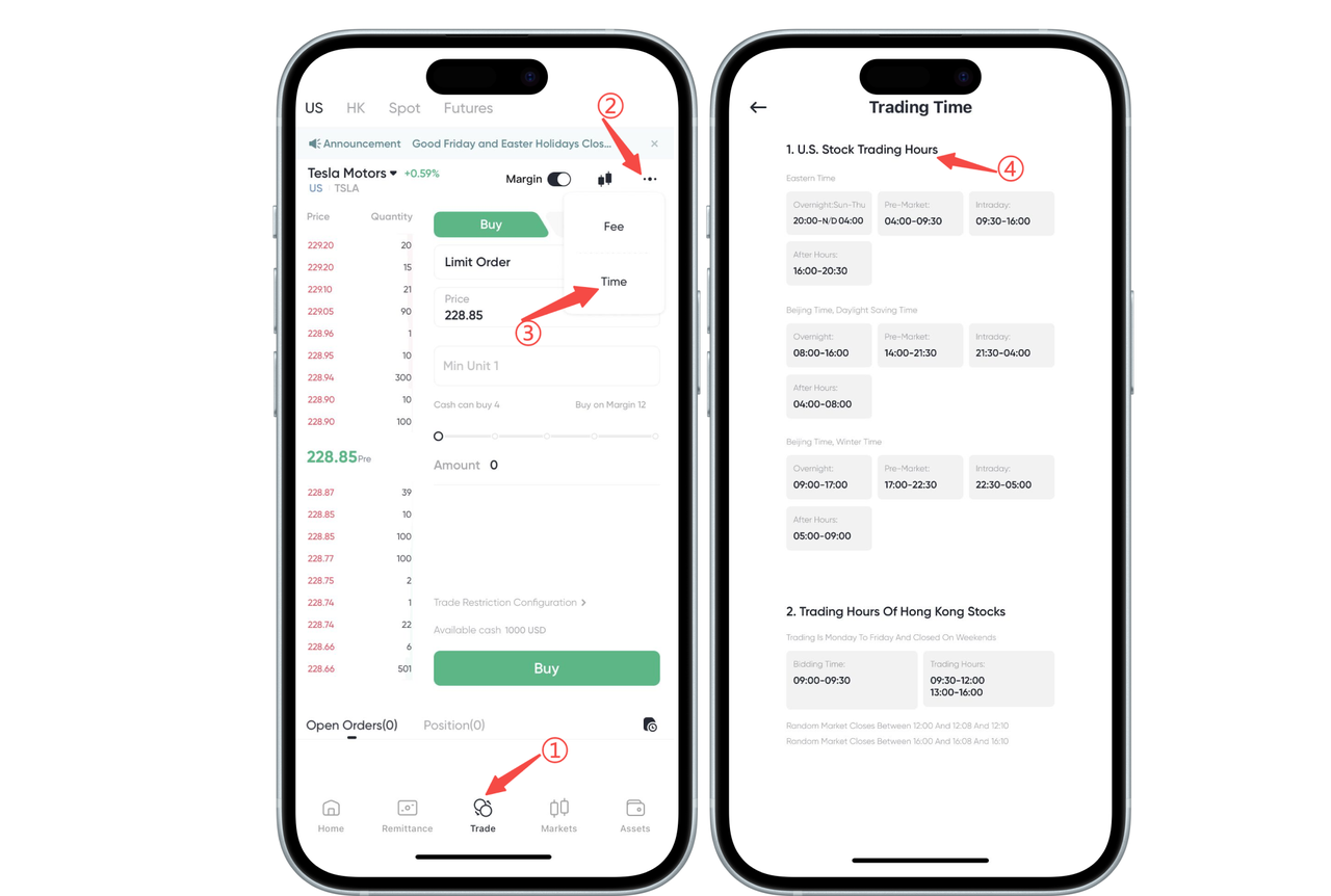 You can click the three dots in the upper right corner of the stock [Trade] page to view US stock trading hours