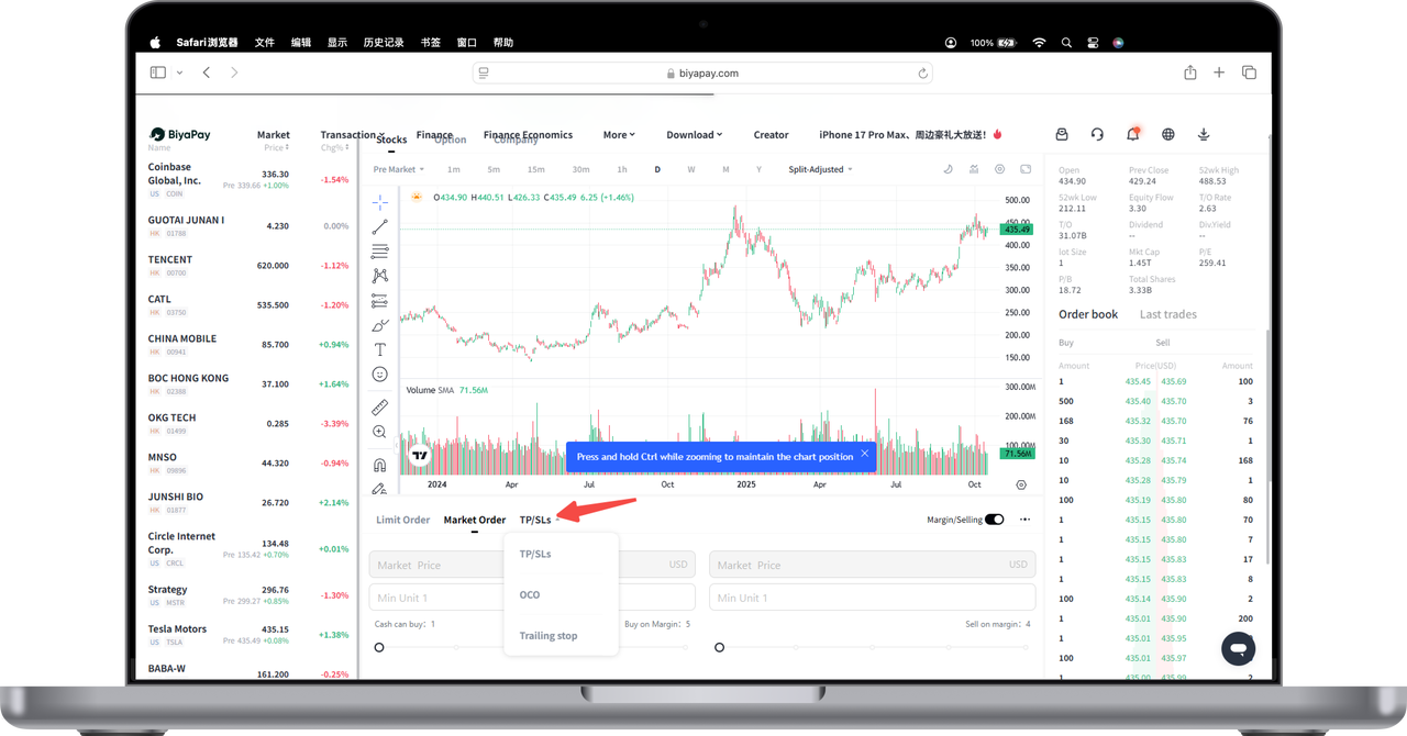 BiyaPay supports five types of orders for US stock trading: Limit Order, Market Order, Take Profit/Stop Loss, Bidirectional Take Profit/Stop Loss, and Trailing Stop.