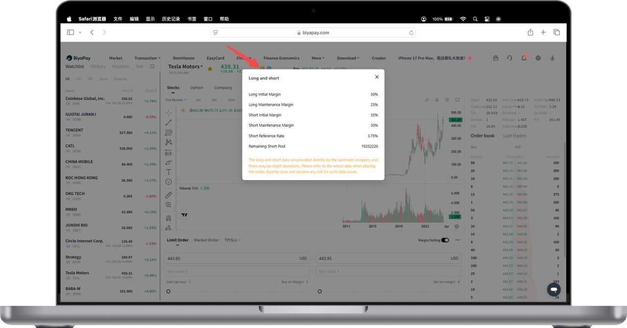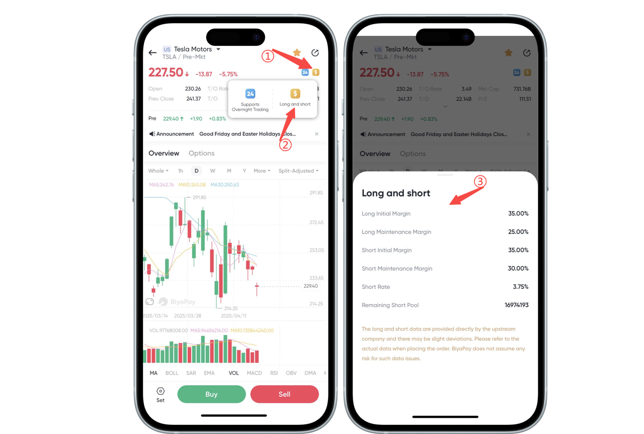 Click the yellow "Margin" icon in the upper left corner of the stock chart page, and the system will pop up a prompt box explaining whether the stock supports margin trading or short selling, as well as related margin ratios, reference rates, and other information.