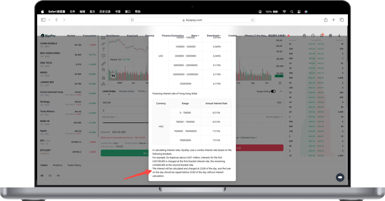 Margin trading and short selling interest is calculated on a daily basis and settled uniformly at 23:00 every day: