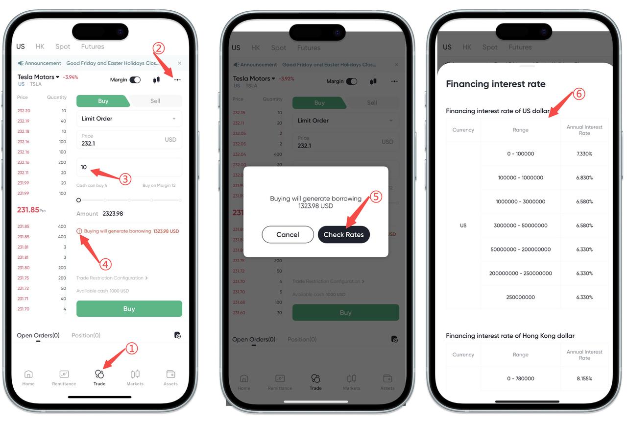 5. The system will pop up the current margin rate table, and you can view the annual interest rate according to your margin amount (as shown in figure ⑥).