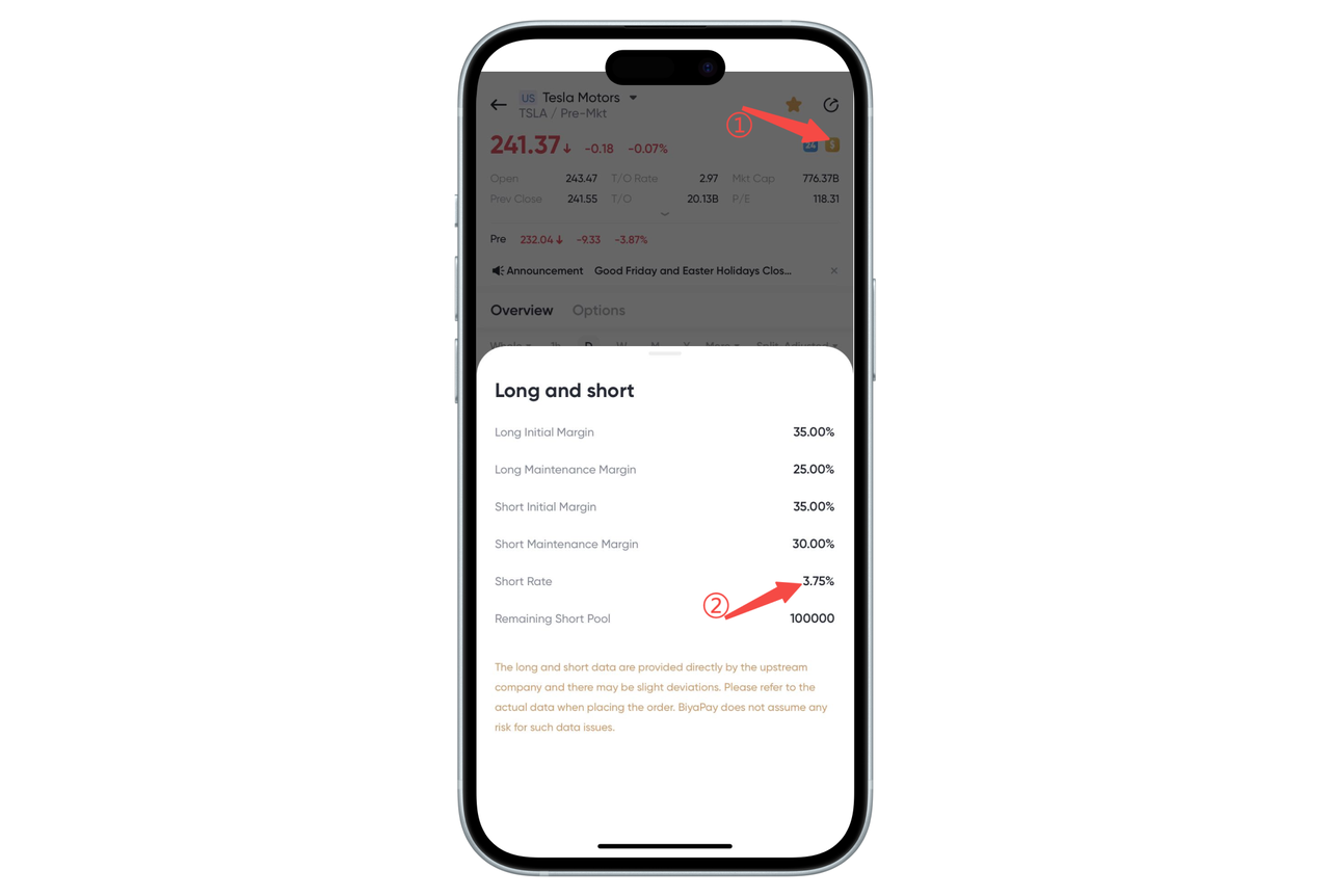 Click the yellow Margin icon in the upper left corner of the stock chart page, and the system will pop up a prompt box showing the short selling annual interest rate. The short selling annual interest rate will change dynamically according to the daily market supply. Please refer to the page data for the actual interest rate.