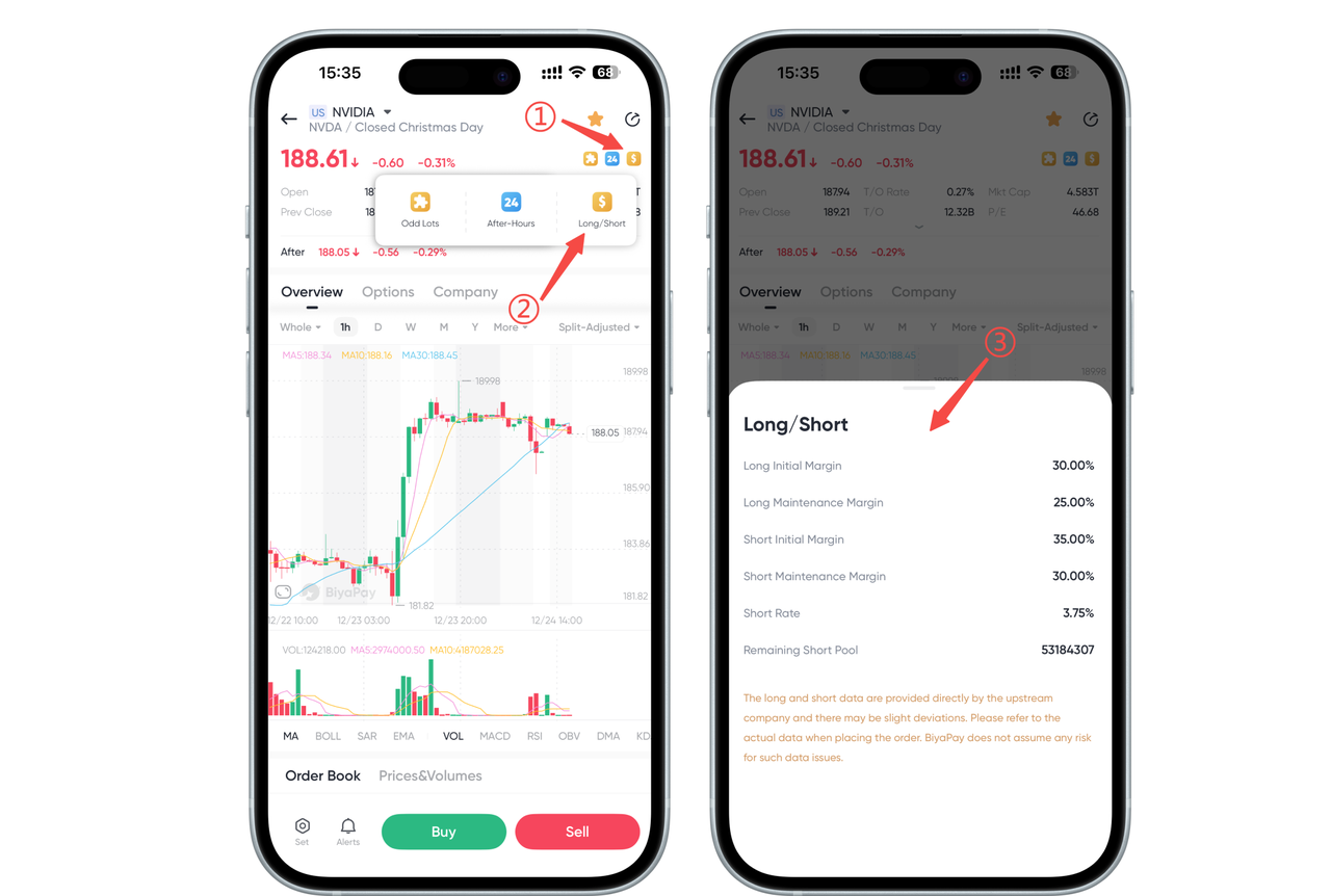 Click the yellow "Margin" icon in the upper right corner of the stock chart page, and the system will pop up a prompt box explaining whether the stock supports margin trading or short selling, as well as the relevant margin ratio, reference rate, and other information.