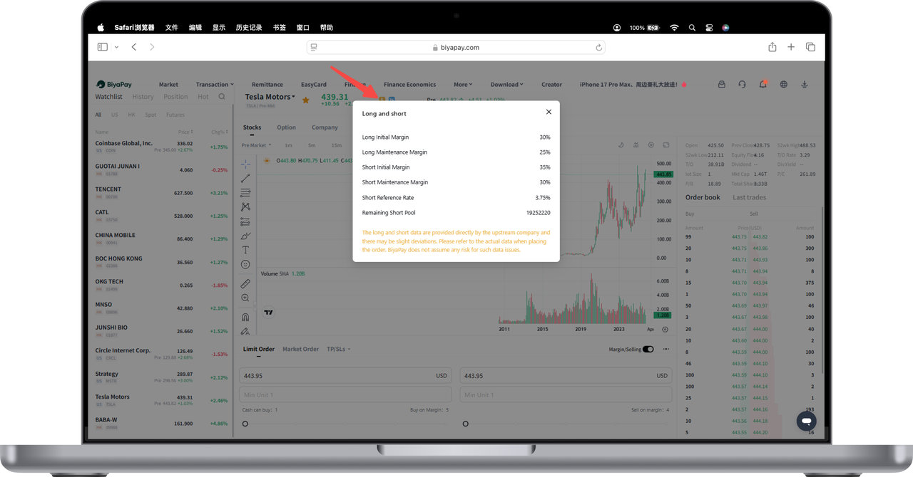 Click the yellow "Margin" icon in the upper left corner of the stock chart page, and the system will pop up a prompt box explaining whether the stock supports margin trading or short selling, as well as the relevant margin ratio, reference rate, and other information.