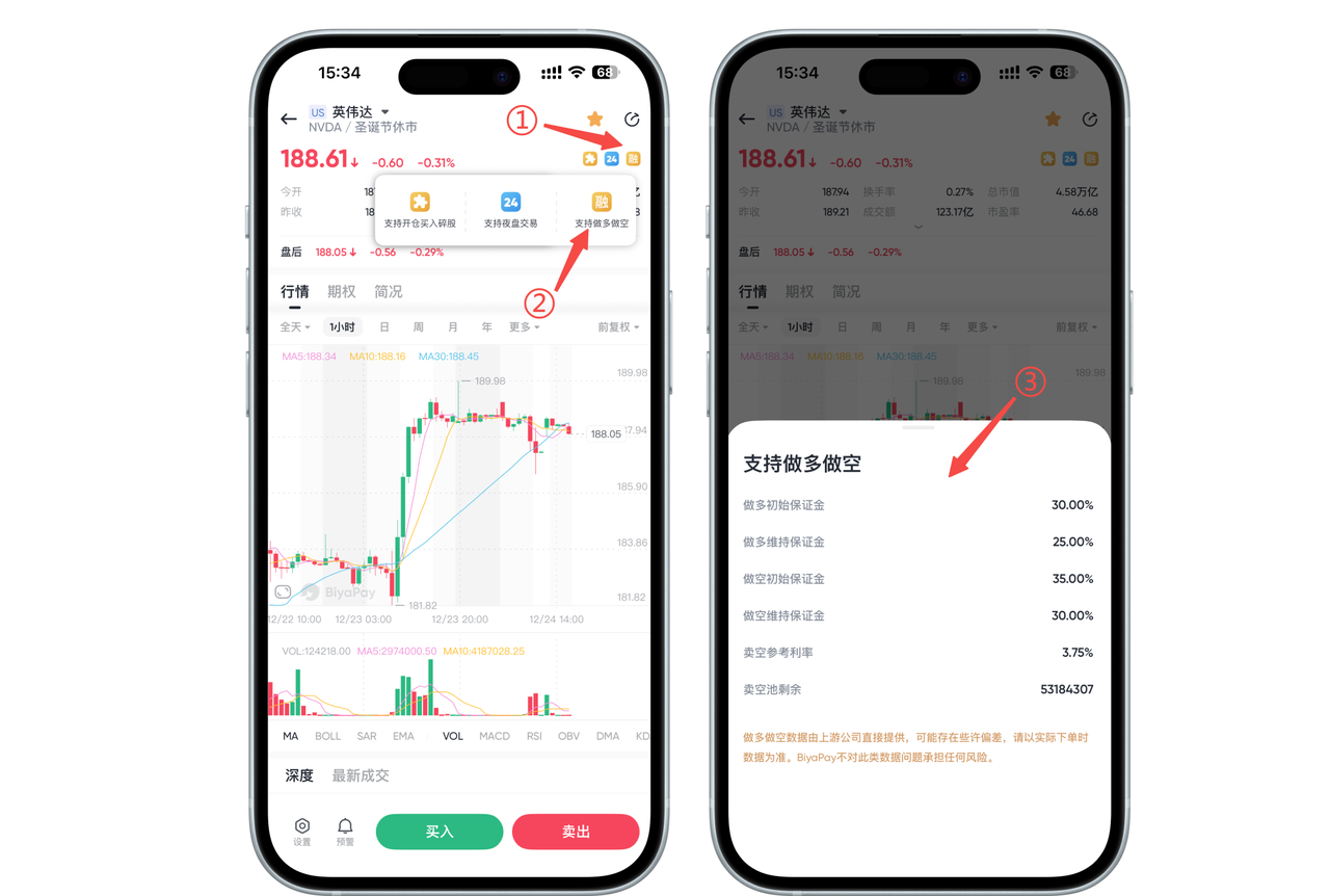 Click the yellow "Margin" icon in the upper left corner of the stock chart page, and the system will pop up a prompt box explaining whether the stock supports margin trading or short selling, as well as related margin ratios, reference interest rates, etc.