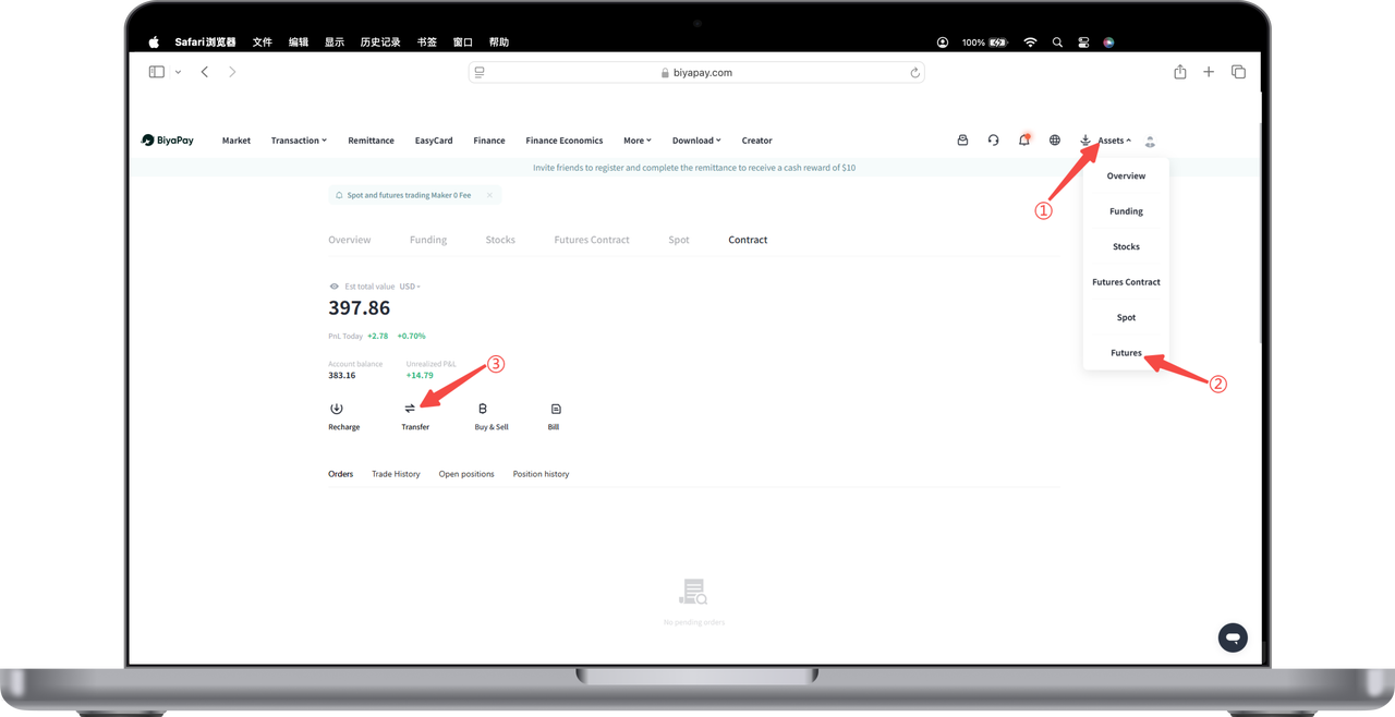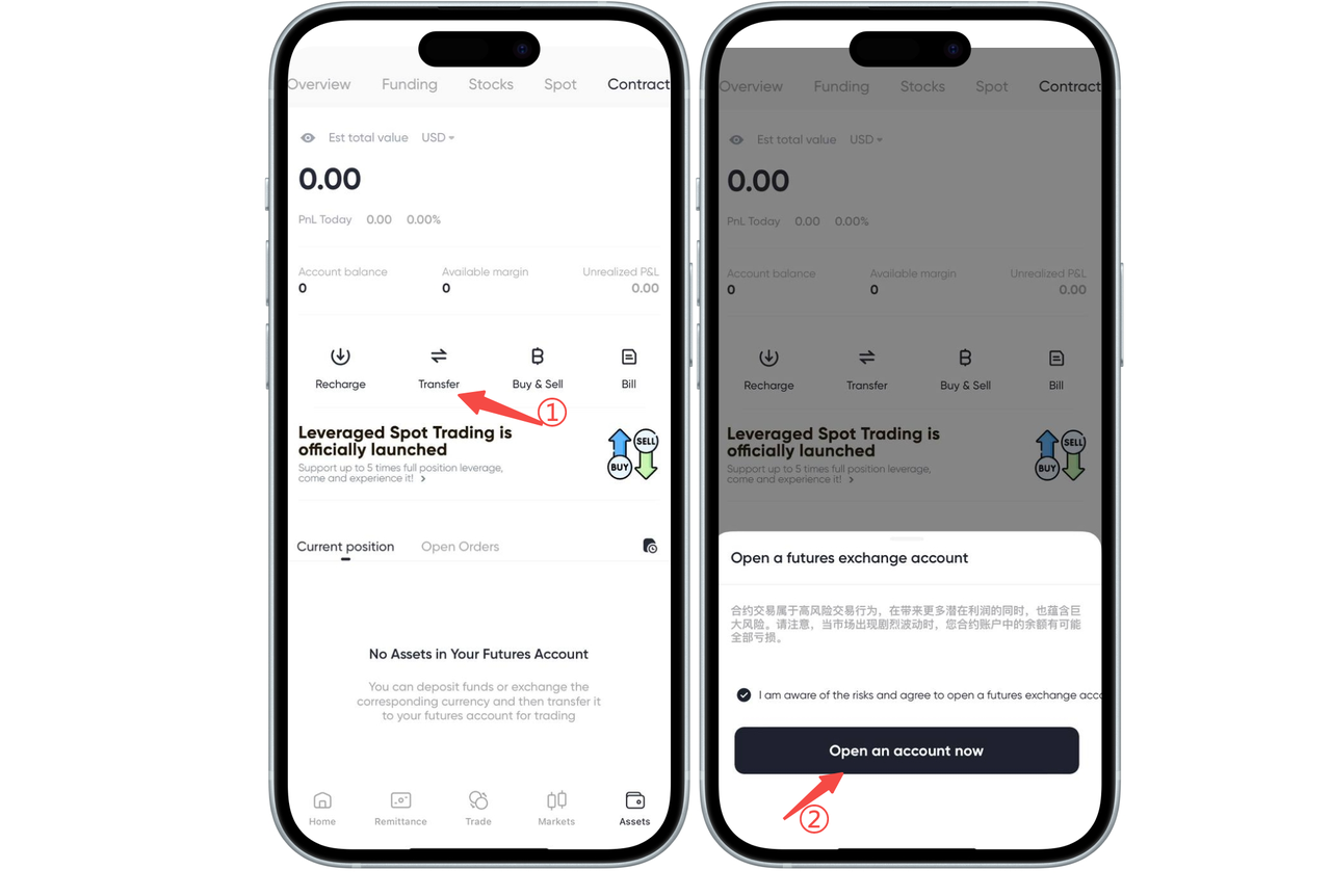 Click [My Assets] - [Contract] in the top right corner of the webpage. On the contract page, click [Transfer], and the [Open Contract Account] page will pop up. Click [Open Account Now], and you will have opened a BiyaPay cryptocurrency contract trading account.