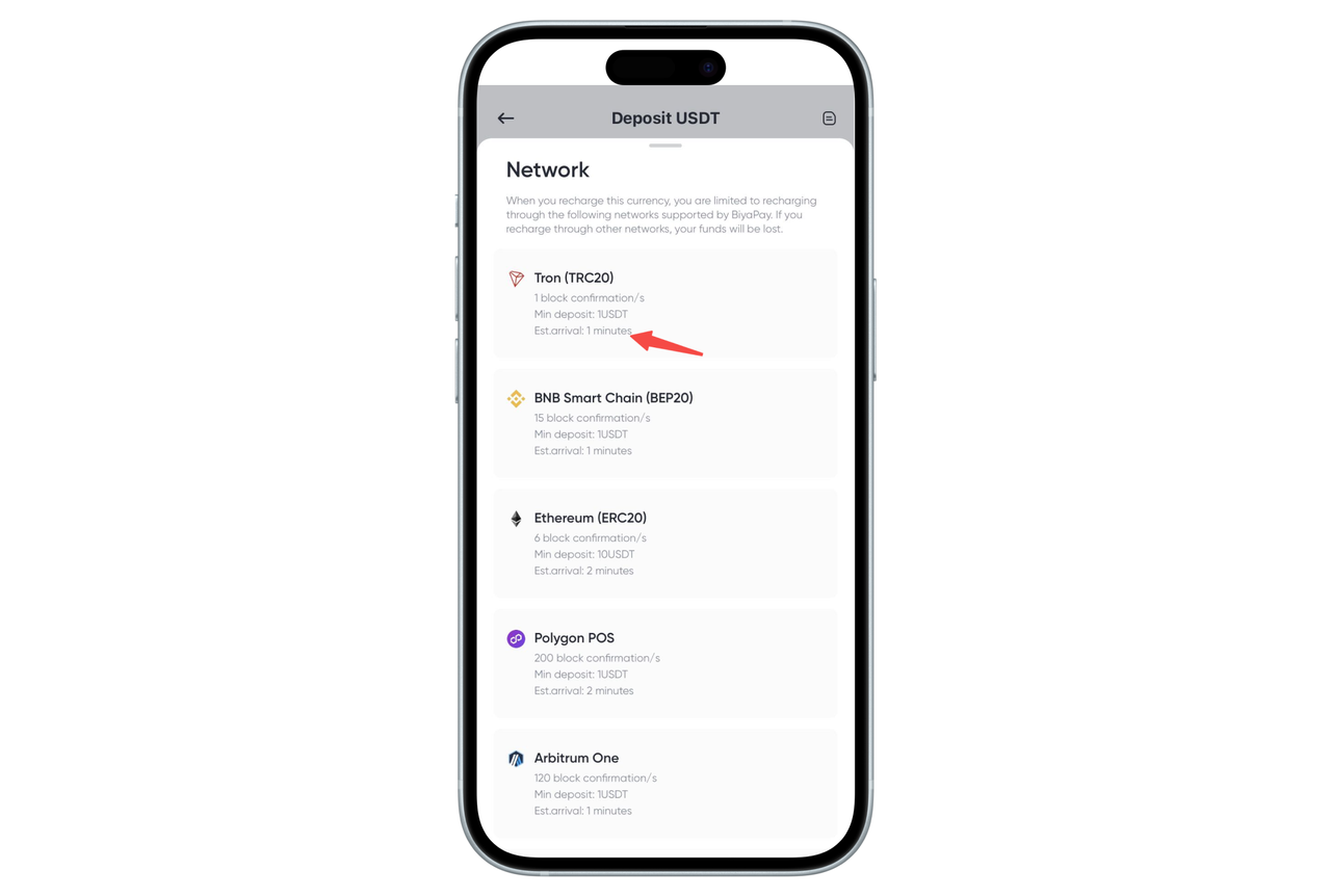Choose the right blockchain: Choosing Tron (TRC-20) or Solana (SPL) networks can significantly speed up USDT deposit speed.