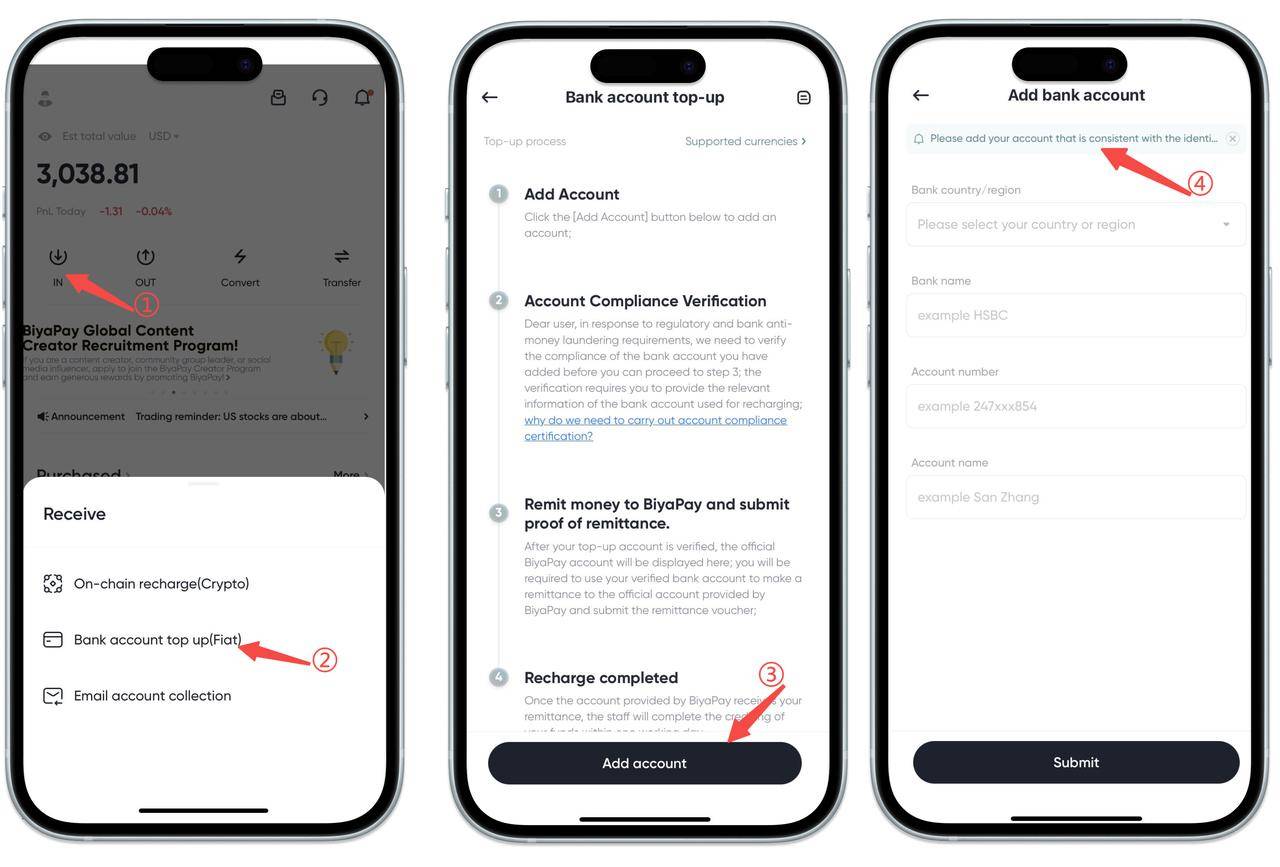 1.Open the App homepage, click [Deposit] - [Bank Account Deposit (Fiat Currency)], and add a payment account.