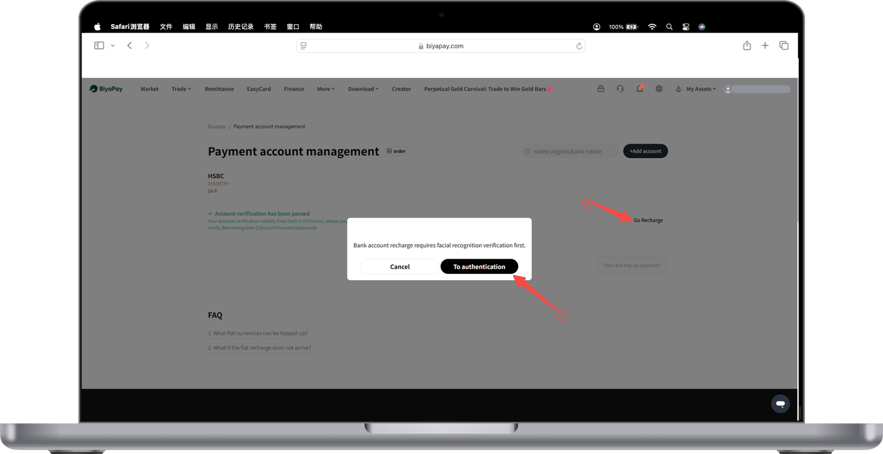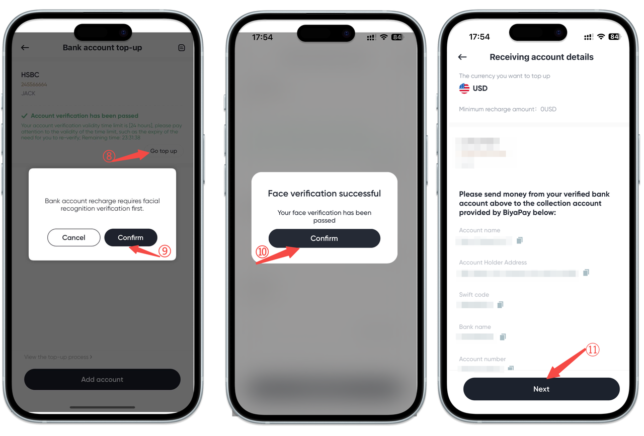 3.After the review is approved, click [Go to Deposit] in the lower right corner of the verified account, and perform face recognition verification. Remit to the displayed receiving bank account.