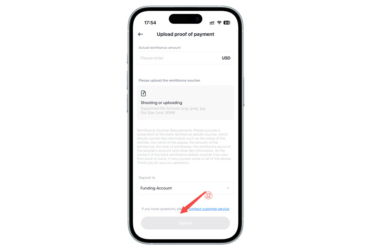 4.After the remittance is completed, enter the remittance amount, upload the remittance voucher screenshot, and click [Submit].
