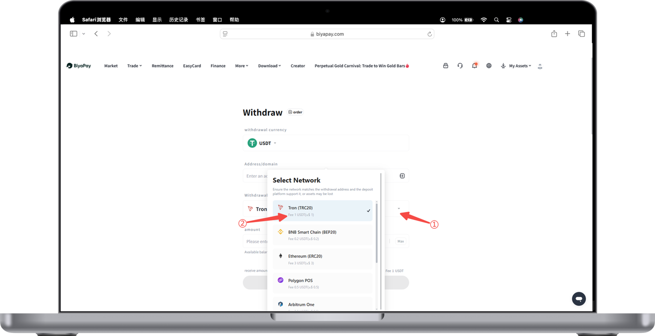 When you select different networks on the withdrawal page, the corresponding on-chain fees will be displayed.