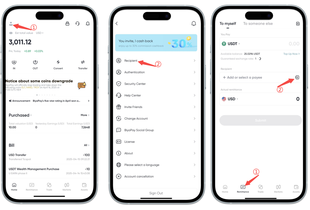 Select the [Remittance] page at the bottom of the App, click [Remit to Self] and [Remit to Others], and add recipient information