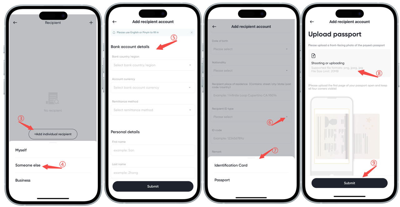 [Others] recipient bank account requires adding the other person's bank account information, personal information, and uploading the recipient's ID card or passport.