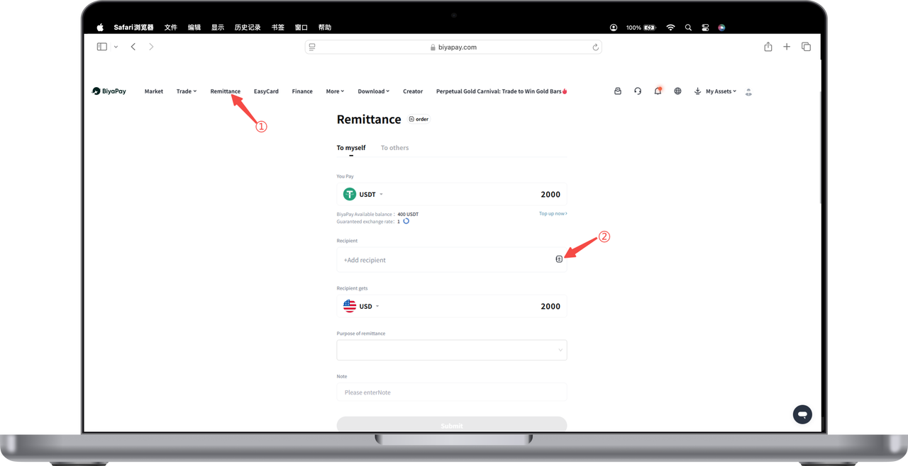 Select the [Remittance] page in the upper left corner of the webpage, click [Remit to Self] and [Remit to Others], and add recipient information