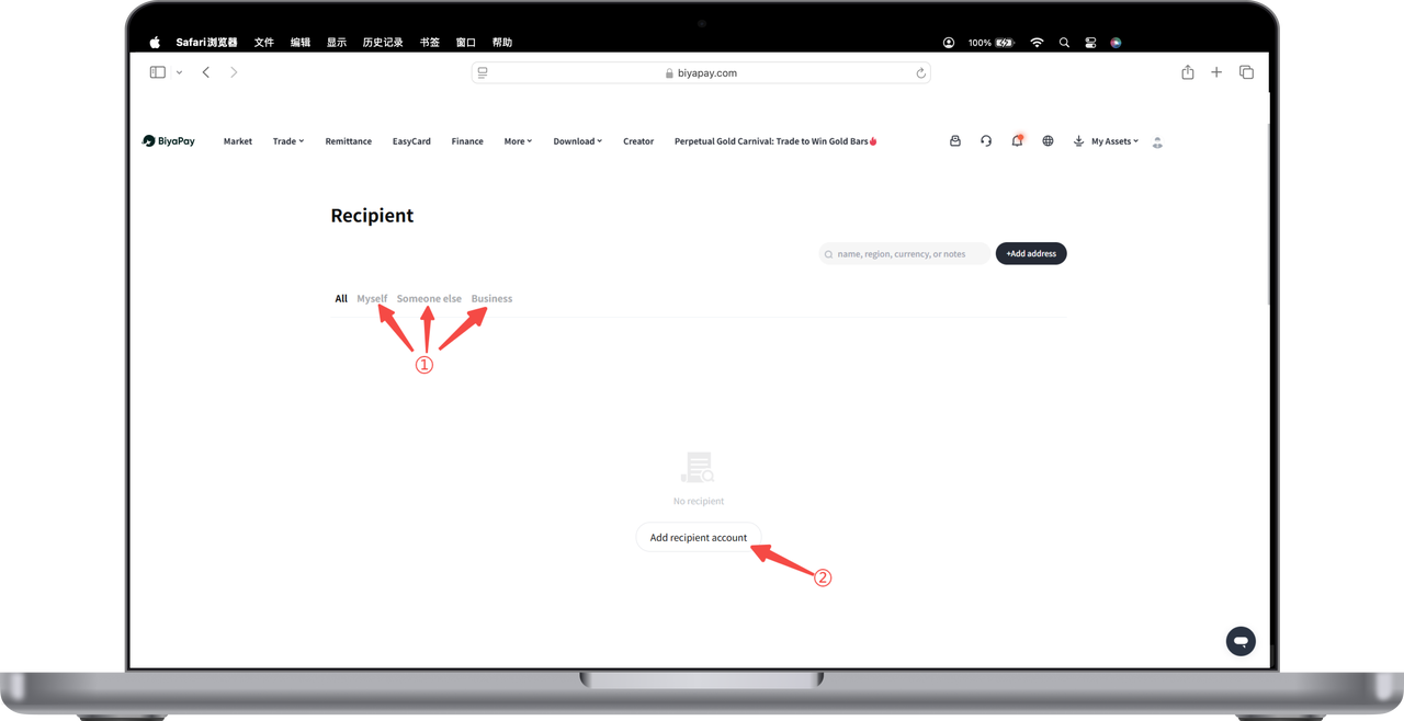 Click the avatar in the upper right corner of the webpage to enter [Personal Center], select [Recipient Management], and add recipient information