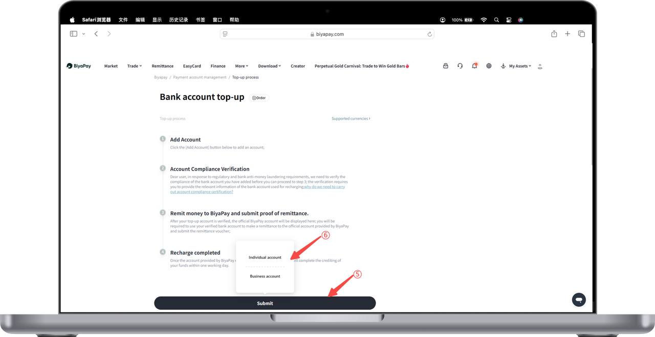Select [Remit to Business], please fill in bank account information and enterprise information according to requirements, then click submit