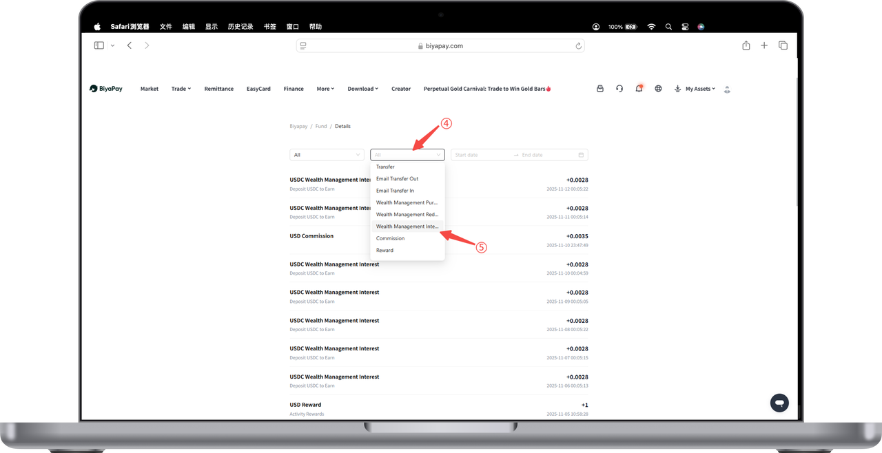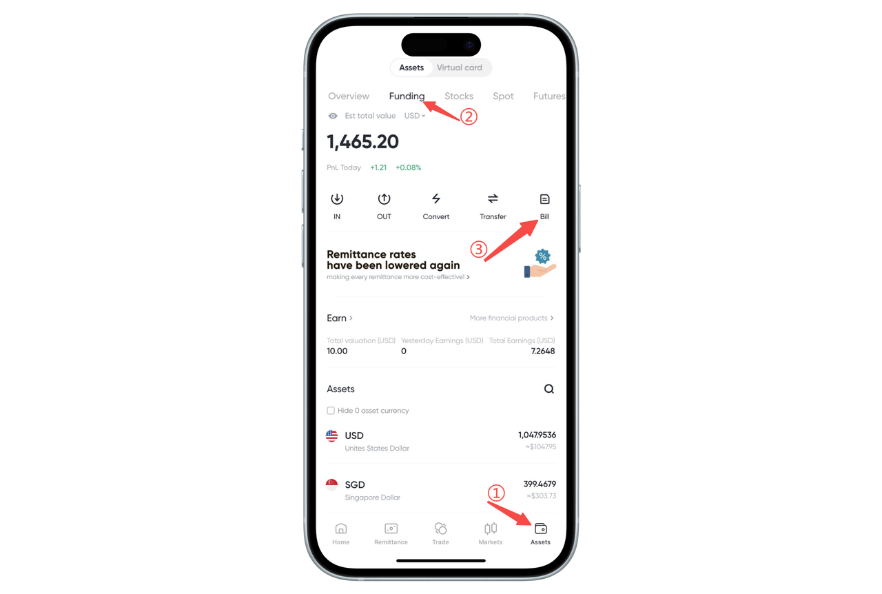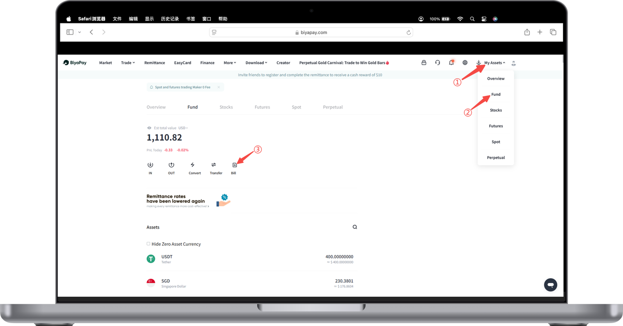 1.Open [My Assets] - [Funds] in the upper right corner of the webpage, click [Bills] on the funds page.