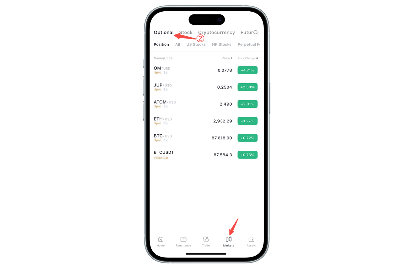 On the [Market Quotes] page in the bottom menu of the App, you can view the [Watchlist] feature.