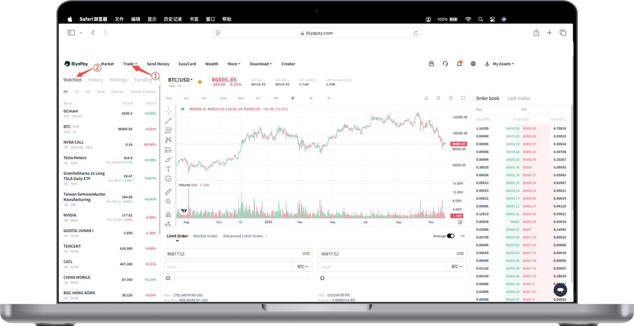 Click the [Trading] page in the top menu of the webpage, and you can view the [Watchlist] feature.