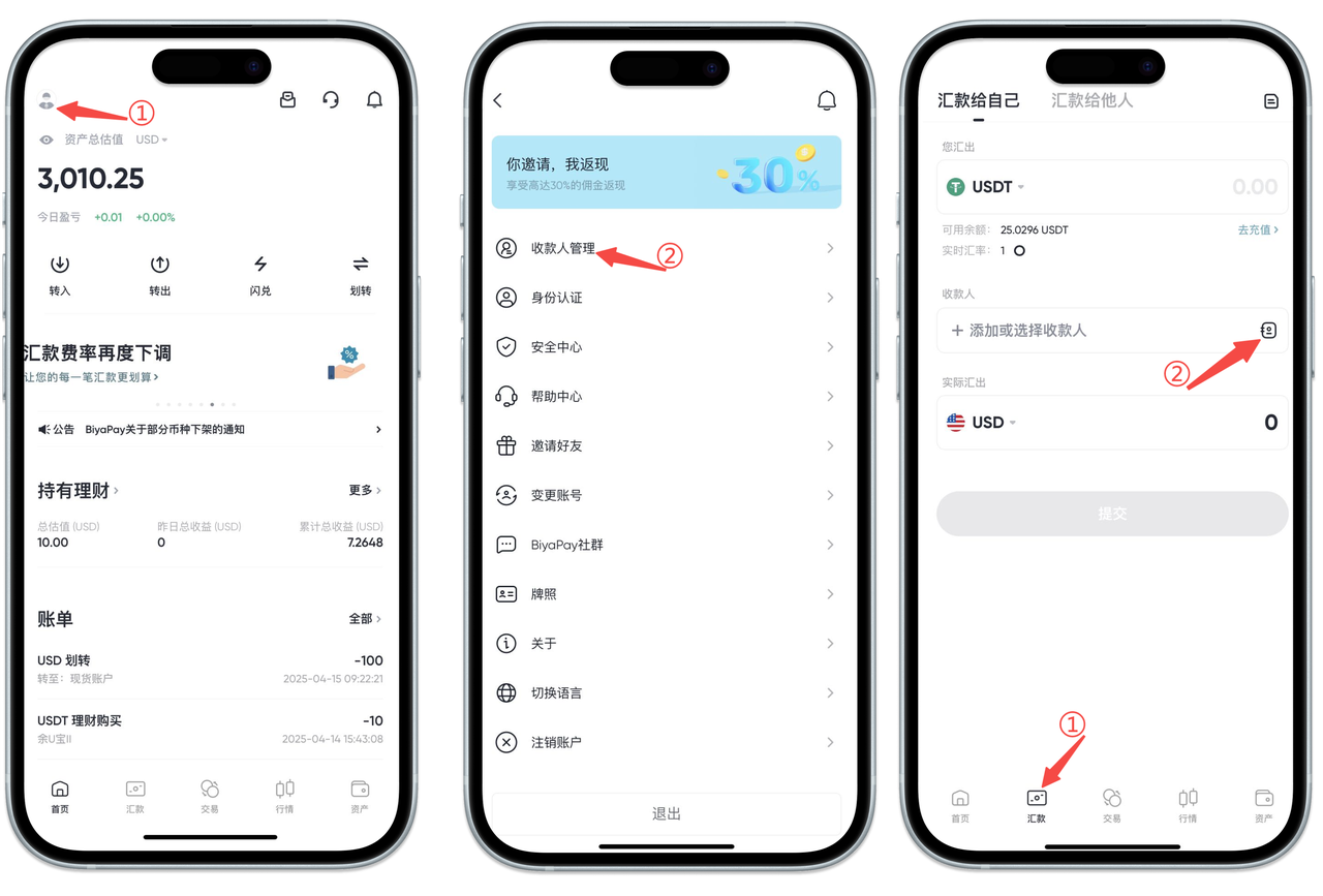 点击APP首页左上角头像进入【个人中心】,选择【收款人管理】,添加收款人信息