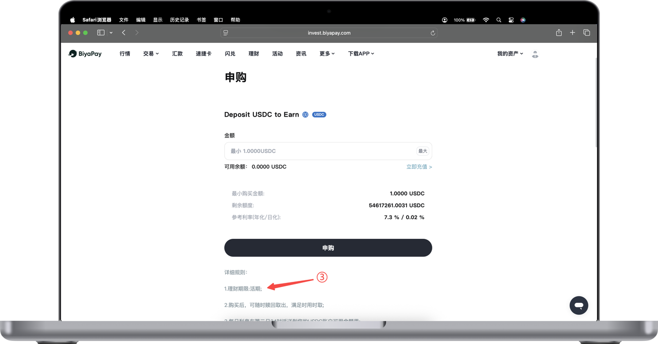 在 BiyaPay Web 端,不同理财产品会在产品列表和申购页面中明确展示理财期限或赎回规则。你可以通过以下步骤查看对应的期限说明。