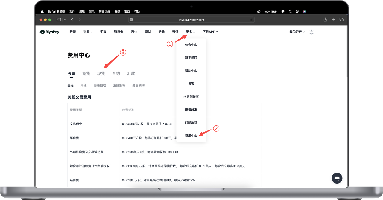 在 BiyaPay Web 端,费用中心 用于集中展示各类交易产品的手续费、保证金及相关费用规则。你可以通过费用中心提前了解交易成本,合理规划交易操作。