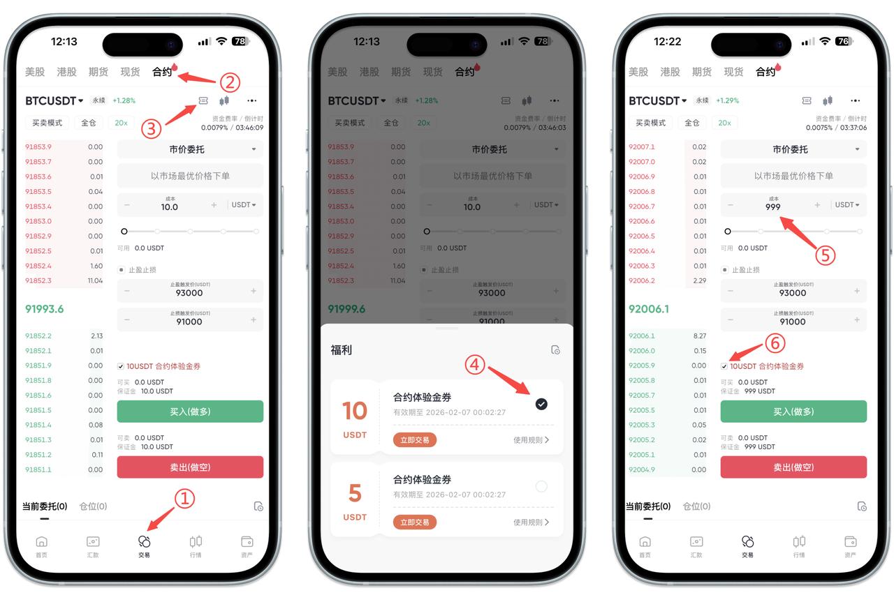 点击"交易"选项,切换至"合约"交易页面,选择"福利",勾选您想要使用的合约体验金,手动填写想要下单的合约仓位金额*(合约仓位金额 = 合约体验金面值 × 杠杆倍数 )*,点击买入(做多)或卖出(做空)即可开启您的首笔合约交易体验!