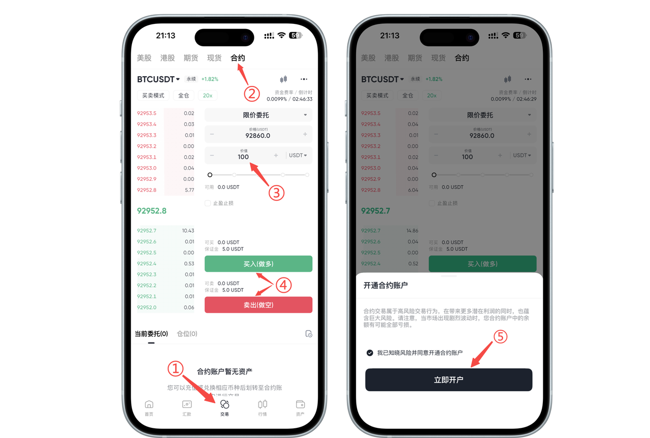 点击底部"交易"选项 → 点击"合约"页面 点击"金额"输入框,手动输入任意 ≥ 100 USDT 以上的金额,点击做多或做空,即可弹出合约账户开通提示,勾选"已知晓风险"的选项后,点击"立即开户"即可开通合约账户。