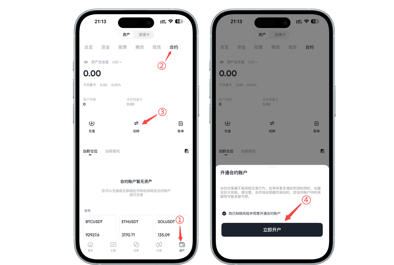 点击"资产"选项 → 点击"合约"页面 → 点击"划转",即可弹出合约账户开通提示,勾选"已知晓风险"的选项后,点击"立即开户"即可开通合约账户。