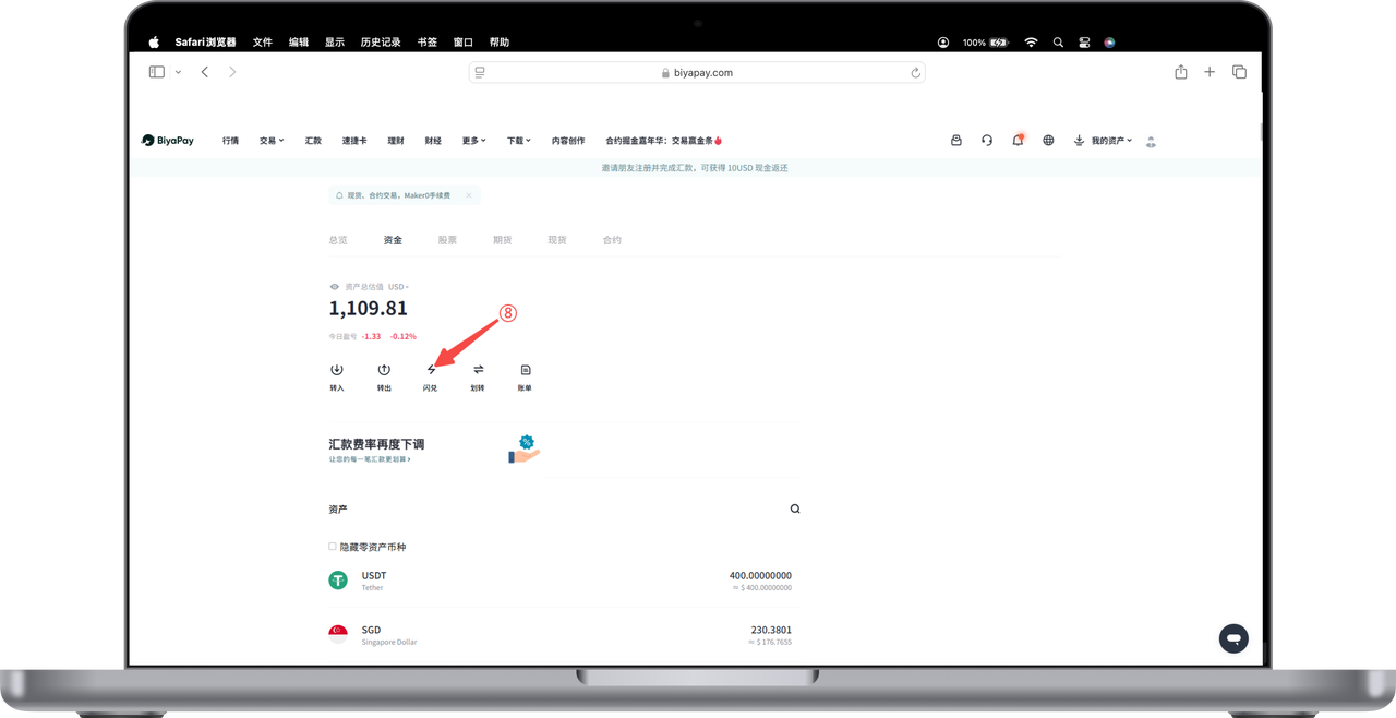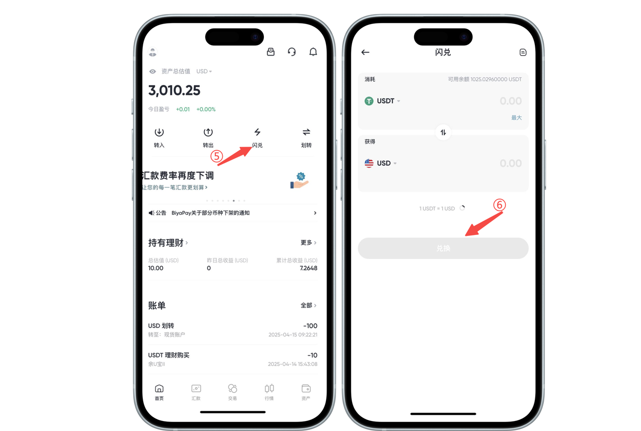 1、在资金页面点击【闪兑】,先把USDT闪兑成USD