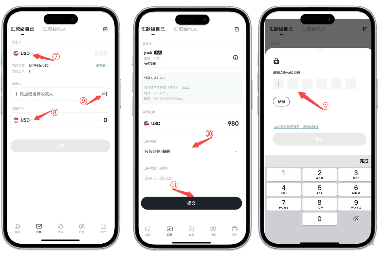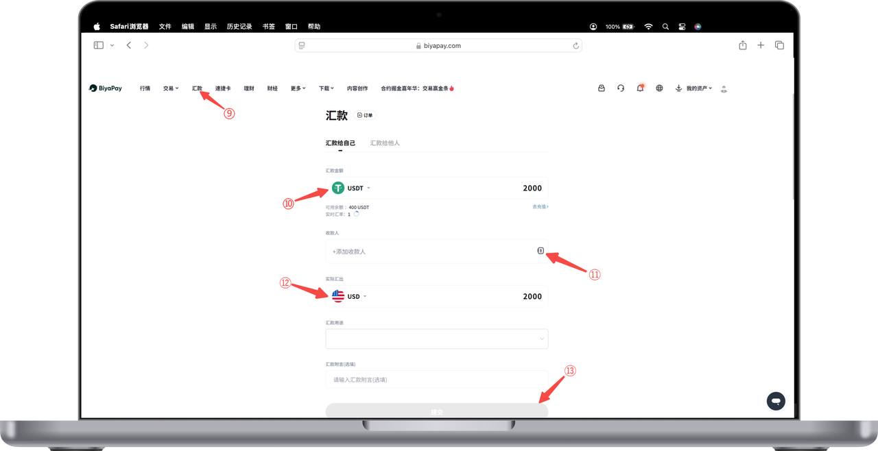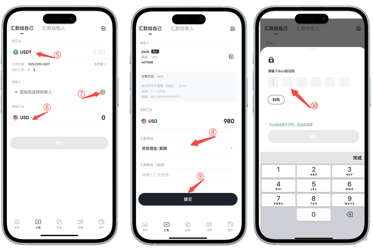 【汇款】页面,选择汇出USDT,实际汇出USD,选择收款人账户,输入邮箱验证码或者Biya验证器码进行提现。